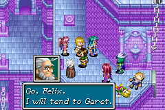 During their climb through Jupiter Lighthouse, the group suddenly become aware that Isaac's party have entered the tower in an effort to stop them, and Kraden will tell Felix off if the latter says "no" when Piers asks if Isaac is a friend of his, saying that they have much in common even if they are at odds right now. Felix's party are then able to watch from a distance as Karst and Agatio lead Isaac's party into a trap and divide them, and Felix at least agrees with Kraden to step in before the Mars Adepts kill Isaac and the others. Felix and Kraden's party step forward to force Karst and Agatio not to finish off their weakened opponents; since Karst and Agatio are badly injured from their fight with Isaac, Kraden stresses that the duo are in no shape to fight all four Adepts among Felix's party, which successfully convinces Karst to capitulate.