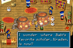 Babi disclosed to Kraden that he had once intruded upon the secluded, mythical society of Lemuria far out in the Eastern Sea, a locale in which the life-extending powers of Alchemy apparently remains unbound. Babi has had need for Lemuria's alchemy ever since he left the lost city with a stockpile of its mystic draughts, but he had consistently failed in his efforts to rediscover the location of the isle over the near-century that has transpired since. Thus, Babi spent decades advancing Kraden's education and molding him into the world's foremost authority on the lost art of Alchemy, and Kraden made his own unsuccessful efforts to find Lemuria over this span of time. Eventually, some years before the beginning of Golden Sun, Babi sent the now-near-70-year-old Kraden on a journey up north to directly study the secrets of Alchemy that are said to lay dormant in Mt. Aleph, hoping that Kraden would discover an alternative solution before his stockpile of life-extending draughts would run out.