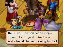 When Matthew's party first arrives in Yamata, Kushinada is seen desperately leading a prayer vigil for Himi, who had fallen into a coma after the Grave Eclipse was activated. Despite these prayers, Himi remains unresponsive, leading Kushinada to work herself to exhaustion. While Matthew is speaking with Susa regarding the Eclipse, Kushinada collapses, leading to fears from the other members of the vigil that a curse has hit her in the same manner as Himi. While Susa and company are checking on Kushinada, Himi wakes up, thanks to the Third Eye treasure that Matthew had been carrying. When Himi decides to join the team, Kushinada is visibly devastated at the thought that both her children will be gone. She is placed in bed to rest, and Susa stays by her bed, watching over her.