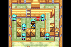 All Aqua Jellies turn into puddles which can be turned into ice pillars with the Frost Psynergy, and a second Aqua Jelly below the first demonstrates that this will be used in solving puzzles; defeat it, freeze its puddle into a pillar, and hop left across the pillar to reach a chest containing a Potion. Proceed down the stairwell to the lower right, and enter a doorway in the hallway beyond that (incidentally, hallways like this that are not inhabited by Aqua Jellies are areas with random encounters against Conch Shells, which are only fought in these areas at this point in the game). The subsequent room has many Aqua Jellies visible amongst crates, but you cannot reach them for now, so exit out of the doorway to the lower right, and in the next hallway enter the doorway to the right.