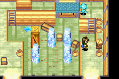 The next room is the first room where you are to employ the Aqua Jelly/frostable puddle mechanic to proceed. Climb down the ladder, defeat and Frost the two lower Aqua Jellies, and Move the tall crate into the spot in between the two ice pillars to create a hoppable path to the doorway to the lower right. In the hallway you exit out into, ignore the crate to the left as you enter the next doorway to the right.