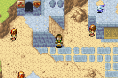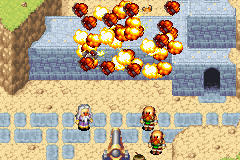 - The dialogue in the small scene after the wall is destroyed does not change depending on the docked location of your ship. Therefore, if one uses the Hover Psynergy to dock the boat on land, the dwarf in the scene will still say there's a boat docked on the beach to the southwest, even though this is untrue. One could place the ship right outside Loho for a rather amusing effect: upon exiting the town after the cutscene, the dwarfs will walk towards you from the beach to tell you that that your ship has been outfitted with the cannon even though the ship is right next to you. This is a simple oversight by the developers.