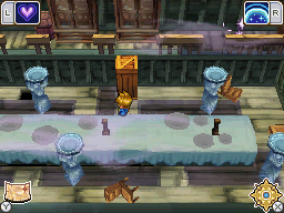 Now climb the ladder northwest of the table and use the top two shifting statues and the crate between them to hop over to the northeast sparkles (as the two cupboards left of it will push you off if you cross in front of them). Another casting of Search will reveal an inanimate statue that must be pushed one space down and then all the way to the right to keep the original possessed dresser pinned into place. Now you can hop left across the three shifting statues running along the south edge of the table to get to the stairwell at the left edge of the dining room, though climb down to the chest containing the Mist Potion first.
