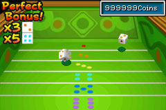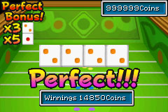 An additional element to increase the potential for winnings is called the Perfect Bonus. At each game played, two of the six dice values chosen at random will have multipliers next to them shown on the upper left of the screen. This means that if you roll four of a kind of the value next to the multiplier, your total winnings will be multiplied accordingly. This is the equivalent to the Jackpot value. In the example pictured, the four-of-a-kind rolled is based on a value of two, which currently has a Perfect Bonus multiplier of 3, so the payout is 15 times the value of the original bet instead of five times. The highest payout for Lucky Dice possible, based on having a level 99 party and rolling a four-of-a-kind based on a value with a multiplier of five, comes to 24,750 coins.