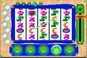 After the player has bet, the lever is pulled and the wheels spin. The player can let them stop spinning on their own or press the R button to stop them. When they stop, the player decides which slots to hold. Slots that are held do not spin when the lever is pulled next. The player has 5 spins in which to score. With this in mind, the player must match up the symbols that correspond to the prize he or she wants in a row.