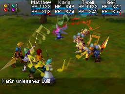 In The Lost Age, Lull's unleash animation visually resembles the transparent image of a Jupiter Djinni summoned in the center of the screen. It then projects a thick, rotating ring of musical notes that grows and covers much of the screen before fading out. Throughout the whole procession, both the Jupiter Djinni and the ring flash the colors of the rainbow, and the "poison cured" jingle plays. In Dark Dawn, the 3D model of Lull is is summoned in the center of the battlefield, and the smaller chain of musical notes it projects this time is a linear band that it projects out from the front. The band extends and swirls twice at an average speed, and the colors this time are different at different parts of the band. The same "poison cured" jingle plays.