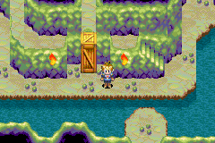 In a room with a bush and a closed door, use Whirlwind on the bush, then use Reveal to show that the seemingly flat wall behind it has a switch you can press to make the door open. Enter the door to find a more cavernous area with water. Go up and right to where a bush and a cell door is; the cell door leads to nothing, so Whirlwind the bush away and enter a door into a room that has three separate cells. Go into the middle cell to find a chest containing Power Bread, then leave out of the room's southwest doorway. Now go up to where a tall crate is, and push that all the way down until it falls to bridge a gap. Hop left from the crate and go beyond the cell door to the left, then whirlwind another bush and press another switch behind it to make another door open.