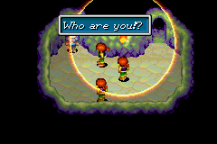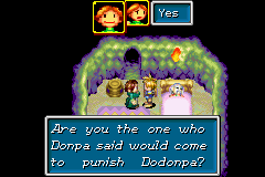 Later in Golden Sun, Isaac's traveling party of Adepts may decide to put their pursuit of Saturos' group on hold and return to Angara to attempt to rescue Hammet themselves; this decision came about as a result of the concerns of one of Isaac's party members, Ivan, the servant of Hammet who originally joined Isaac's party because he was unable to save Hammet on his own terms. The Adepts arrive at Lunpa and use the Cloaking Psynergy they received from Babi in Tolbi to sneak past the patrolling brigands of the fortress. When they finally find Hammet's cell deep in the cavernous basement floor of the fortress, Dodonpa himself suddenly steps in to announce that he won't be giving Hammet up to little kids like them; he flips a switch to open up a chamber containing a massive, amphibious monster Dodonpa was vain enough to name after himself and directs it to crush them.