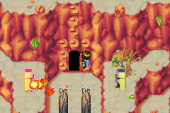 Once you have Isaac's party added to your roster, use the Lift Psynergy on the round boulder to make it float, and climb up to the little black entrance. It leads to a small area where a chest waiting for you turns out to be a Mimic, which drops one of the game's Apples when defeated. This screen can only be progressed through after descending downstairs from the dungeon above, so step back outside and climb the cliff ladders surrounding the black entrance to begin the climb up through the exterior portion of Magma Rock.
