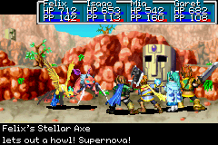 Jenna, glad to have finally found the Elemental Rock tablet for her own element after the other three Rock dungeons gave special abilities to her friends, is magically imbued with the ability to manipulate standing fire. The party also retrieves one of the leftover Magma Balls for themselves on their way out. This allows them to make use of the ancient Cannon recently unearthed at the village of Loho further north, which is what ultimately allows the party to breach the remote Northern Reaches and reach the final destination on their quest, Mars Lighthouse.