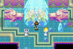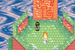 Once you return to the hub of "upper Mars Lighthouse" after having lit all four colored torches at the end of their respective sub-dungeons, the dragon head statue will speak to you again, and it will then create a Teleport pad on the ground by blasting the ground with a fireball. Casting Teleport on this Psynergy will bring you to the aerie of Mars Lighthouse itself; you can hop left and up along the floating platforms and still be able to Teleport back and leave the building. Be warned, however, that you will cross the game's point of no return while walking up the gray steps at the center of the aerie, just south of the open well; a long cutscene will transpire and automatically thrust you into the game's final storyline battle, which is against three forms of a monster named the Doom Dragon in a row without any break in between. If you can beat this, the gameplay portion of Golden Sun: The Lost Age is complete, and there will come a point when you can control Felix by himself and talk to his party members individually. Follow along with the remaining cutscenes of the game by approaching the well and selecting "Yes" when prompted.