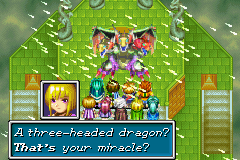 You will follow along a long and winding, linear route to a chamber where two large, orange dragons are trapped motionless inside a slab of ice. Cast Blaze on the flaming torch from the right to create a crack in the ice, then cast Burst to break open the ice and automatically initiate the boss battle with the two Flame Dragons inside. They will fight with similar abilities to the previous boss fight in the game, which took place at Jupiter Lighthouse. When you defeat them, a cutscene will take place, after which you must interact with the Mars Star to add it to your inventory in the form of a Mythril Bag. After the dragon head statue in the room "talks" to you, stand in front of it and use the Mythril Bag in your inventory to "reactivate" Mars Lighthouse, changing the color of the dungeon's overall tileset. Cast Retreat to return to Mars Lighthouse's exterior screen.