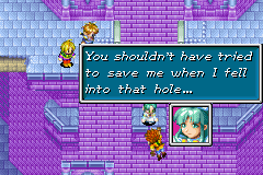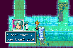 During the group's own climb through the Lighthouse, a trap on one of the tower's outdoor levels is suddenly sprung by outside forces, and Mia falls onto a precarious ledge below. Garet lets himself fall into the same trap in a spur-of-the-moment decision to try to save her, only to end up injuring his left arm and render himself hanging helplessly from the ledge with his right, and Mia does not have the physical strength to pull him back up. With half of Isaac's party now divided, the responsible parties step forth and identify themselves as Karst and Agatio, Mars Adepts out to avenge the slain Saturos and Menardi. They admit that they were aiming to separate Mia from the rest of the group so that they would not have to account for her Mercury-aligned powers, and snagging Garet as well was a nice bonus. The duo also announce that they have since allied with Alex... though they immediately come to realize that Alex has just abandoned them and left them to deal with Isaac's party themselves.