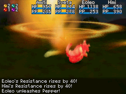 When Pepper is unleashed in battle, the user deals a Mars-based attack equal in power to the user's normal physical attack multiplied by 1.5. Then, there is a chance that the enemy will be afflicted with the Stun status condition.