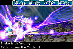 By this point in the game, the player can have the first twenty-four Djinn available, six of each element, meaning a variety of options are available. Most efficient may be to put one Djinn of each element On Standby, allowing for two Barbarians and two Savants - have the Brutes spam Planet Diver against Poseidon, while the Savants heal using Wish Well as necessary or attack with Plasma or their physical attacks. Another option is to use four tri-elemental classes, which allows for a more diverse strategy. Ultimately, victory in this fight is a matter of patience and care - make sure nobody's HP goes too low, and Poseidon will go down eventually.