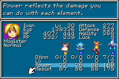 The Elemental Power of an Adept is affected by several factors: their own elemental affinity, Djinn lineup, and equipment. At any time, the maximum Power or Resistance of any element on any character or monster is 200. Naturally, Adepts typically have the most power in their innate element, and lesser, yet fairly equal power in the other three elements. Playable Adepts with no Djinn set and no power-increasing items equipped will have 104 power in their innate element, 78 power in their neutral element (Mercury-Venus and Jupiter-Mars), 77 power in their opposed element (Mercury-Mars and Jupiter-Venus), and 76 power in their symbiotic element (Mercury-Jupiter and Venus-Mars).
