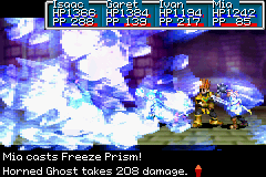 Therefore, a Freeze Prism cast under these circumstances would deal approximately 285 points of damage to the targeted enemy. Since Freeze Prism is a ranged Psynergy, adjacent targets take a percentage of the total damage, with the percentage decreasing as distance from the main target increases. |