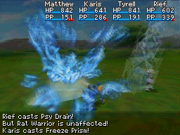 Prism, Hail Prism, and Freeze Prism are offensive, ranged Psynergies. The total damage inflicted is determined by comparing the caster's Mercury Power to the target's Mercury Resistance and using this number to modify the base power of the particular Psynergy in use.