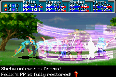 Psynergy Points, often abbreviated to PP, (Japanese: Energy Points, EP) is a "consumable statistic", meaning they can be depleted or recovered (although they cannot drop lower than zero or be raised above a set maximum). PP is most often used to cast Psynergy spells, although some techniques can be used to lower an enemy's PP. It is important to always have enough PP in or out of battle because Psynergy is one of, if not the, most important aspect of the Golden Sun series. The Jupiter Adepts Sheba and Ivan have the most Psynergy Points of the party when in their natural Wind Seer class.