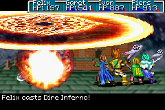 Therefore, a Dire Inferno cast under these circumstances would deal approximately 300 points of damage to the targeted enemy. Since Dire Inferno is a ranged Psynergy, adjacent targets take a percentage of the total damage, with the percentage decreasing as distance from the main target increases. |