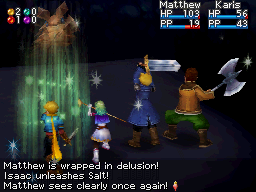 Golden Sun: The Lost Age: Salt can be found as soon as the Great Western Sea is reached, meaning it can be present both as a Venus Djinni to keep set for the sake of classes and as an option to remove Status Conditions for up to Jupiter Lighthouse. In this instance, the only real use Salt has is to cure the Stun status condition that Agatio can cause with his Stun Muscle attack. When Isaac's party joins Felix's party along with their returning Djinn (granted that Password data transfer is in effect), they bring with them an identical equivalent in the Mercury Djinni Tonic. The two are equally usable for whenever a particularly widespread status condition situation transpires, though in a way they are limited because those sorts of situations do not occur often; the only real beneficial use for them in this game is when multiple Adepts are afflicted with Haunt and Death Curse in the fights against the final boss and Dullahan.