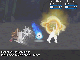 Golden Sun: Dark Dawn: In the short period of time Shine is available to Matthew and Karis in Tanglewood and the Abandoned Mine at the beginning of the game, Shine's damage bonus is astonishingly powerful, dealing around 90 damage when Matthew would be doing a "strong" 30 damage with each of his physical attacks otherwise. Shine, like Sap, scores a one-hit KO on any enemy and makes the Tangle Bloom encounter at the end go by much faster, but unfortunately it is taken away from your possession immediately after this. In the main game, there are more and stronger Mars Djinn that can be collected, especially when Eoleo joins, so Shine won't necessarily be missed.