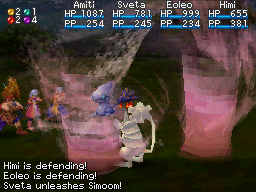 General: Simoom is a very good attacking Djinni because it has both a strong set damage bonus and a chance to inflict the enemy with a strong status condition. 70 set bonus damage is closest to the highest set damage bonus value that attacking Djinn reach, and that makes it a nicely damaging attack for any Adept that unleashes it, even if the Adept unleashing it is a low-attack casting mage. The Venom/Deadly Poison condition that it can afflict the enemy with is useful because it makes the enemy take a large amount of damage each time it takes an action, making its demise that much quicker. Simoom is a stronger version of the Jupiter Djinni Wheeze from The Lost Age.