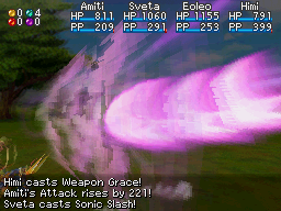 Slash is an offensive, single-target Psynergy, while Wind Slash and Sonic Slash are offensive, ranged Psynergies. The total amount of damage is determined by comparing the user's Jupiter Power to the target's Jupiter Resistance and using this value to modify the base power of the particular Psynergy.