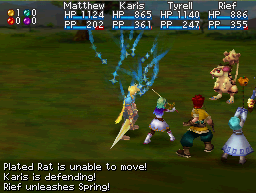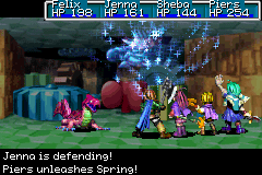 General: There are very few healing effects in any of the games that restore HP based on a percentage. Spring, the only Djinni that restores HP by 70% of the target's maximum HP, can be useful at times, and is more useful than a Djinni like Fizz which restores only by 60% of the target's maximum HP. Nonetheless, there are other Djinn that heal by a percentage which either heal by a larger percentage or offer some separate advantage to make up for not healing as much, like group healing or acting with increased priority. Unless you are planning to set up for a Mercury-element summon by unleashing Spring to heal an Adept's HP, the Ply Psynergy series is probably overall better despite the PP cost.
