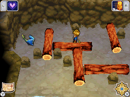 Golden Sun: Dark Dawn: Spring is located in the small cave in Harun Village, which is reached by stepping into the shallow water to the southwest of the main town area. To get past the logs and rocks that block your way to Spring, cast the Crush Psynergy to destroy the large cracked rock. Then roll the rightmost vertical log left, then the rightmost horizontal log down, then the left horizontal log up, then the rightmost vertical log back right, then the left horizontal log back down. You can now get Spring without a fight.