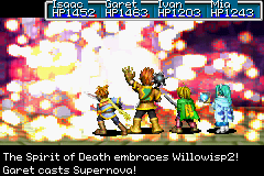 Starburst, Nova, and Supernova are offensive, ranged Psynergies. The total amount of damage is determined by comparing the user's Mars Power to the target's Mars Resistance and using this value to modify the base power of the particular Psynergy.