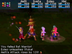 General: The mass-attack-boosting effect that Stoke and other Djinn have is easily one of the best buffing effects in any of the games because the party's damage outputs with any action based on their physical attack statistics will be significantly increased, highly justifying the turn an Adept takes to cast it. Stoke is useful for the rest of the game it appears in once it is found. It is probably best to have it Set onto an Adept that has low attack rating and is dedicated to supporting the party to begin with, so that other, damage-dealing Adepts won't have to interrupt their attacking procedures in order to unleash Stoke.