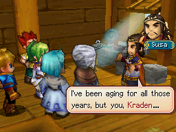 When the Grave Eclipse brings destruction on much of Weyard, Kraden, accompanied by the children of the Warriors of Vale, seeks Susa in order to gain information on the Eclipse. Susa is surprised to see Kraden alive, as the scholar is well over 100 years old. Kraden reveals that he stopped aging due to his exposure to the Golden Sun, a fact which amazes the young Adepts traveling with him. Susa reveals that his daughter, Himi, has been unconscious since the Eclipse began, and while Kushinada has been leading prayers, nothing has been able to wake Himi.