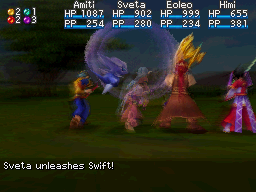 General: Swift's battle effect is the only effect in any Golden Sun game thus far that acts with increased priority and is an actual attack. Unfortunately, that does not seem to be much of a bonus in the long run - in a typical battle, it generally does not matter whether an attack against an enemy is dealt before or after an enemy's action(s) this turn. There may be some obscure, situational benefits to having the Adept deal an attack before any of the other party members where ordinarily the Adept would attack after the others. Swift may also have the capacity to be useful to an Adept that is slower than an enemy that is about to deal a fatal blow - in this case the Adept can score one last hit with certainty. But the attack itself adds an average 50 bonus damage without any side effect besides the high priority.
