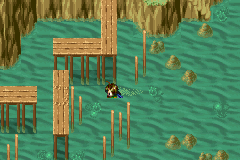 To make it to the east edge of the swamp screen, step back onto the southwest bubble tile, go back north to the tile near the two thin posts, go onto the tile right of them, and step onto the rile right of that at the lower right corner of the raised vertical plank. Now go southeast onto a bubble tile, then directly east onto a bubble tile, then northeast onto a bubble tile between masses of small rocks in the water, then east onto bubbles, then north, then east, and finally southeast to the bubble tile next to a staircase headed up to the right. You will find yourself at a bush and a fidgeting sapling at the southeast corner of the screen. Clear away the bush with Whirlwind to enter the first underground cave network.