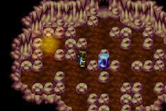 After you climb down the stairs in the purple cave, you will find yourself at the west end of a wide open cave area with steam vents blowing jets of air in alternating patterns to your right. Letting yourself get blown off either of the two cliff slides below them will bring you to the dead-end in the floor below that the stairs off to your upper left will bring you out of, though the dead-end features a cross-shaped pattern of weeds you can clear away with Cyclone to expose a Bramble Seed. Pace yourself to pass through the four steam vents left of the earth pillar and cast Move to shift the earth pillar onto the floor indentation into the left. This is one of two steam vents you must block in this manner to cause the steam vent currently blowing north of a Venus Djinni in an enclosed space to grow strong enough that it can reach the Djinni.