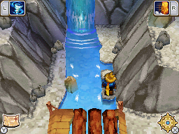 Golden Sun: Dark Dawn: Teardrop is located behind the waterfall in the left screen of Kolima Junction. It cannot be gotten just by entering the junction from the west entrance on the overworld, something you can do as soon as you access the Morgal region, because the river here is not appropriately bridged. You must have progressed through the story until you have triggered the cutscenes at the screen to the right of that, which is only reached once you have played through Kolima Forest below. When you enter this left screen of Kolima Junction from the right, roll a log left to where two other logs are group against a boulder, then cast the Crush Psynergy on the boulder to make a bridge. Hop north of the right log in the water and Teardrop will automatically jump out from behind the waterfall so that you can collect it without a battle. This Djinni, like many others in the Morgal region, can be permanently missed once the final gate in the depths of Belinsk Ruins is entered.