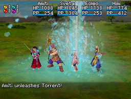 General: Using a turn to double all Adepts' agility ratings basically solves all possible issues of each one of your Adepts not moving before the enemy in a given turn, for several turns. Depending on the boss, this can be highly useful, though it can be argued that a Djinni that halves all enemy Agility ratings is the same, such as the Venus Djinni Vine. There is one advantage the latter has over doubling party agility, though; since the agility boost counts as a buff, it can be removed by the Break Psynergy if the boss has it. But a Djinni that halves the enemy's Agility is something that no enemy in any game can dispel from themselves. In the GBA games, identical equivalents to Torrent are the Jupiter Djinni Zephyr and the Mars Djinni Coal.