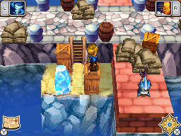 Golden Sun: Dark Dawn: Torrent is located at the upper right port screen of the settlement of Belinsk, and can be gotten as soon as Belinsk is first entered. Go to the port, and you can see Torrent below a bunch of sacks that block your way to it. Climb down the ladder left of it, cast Cold Snap Psynergy on the puddle, move the tall crate to the upper left of it one space right, and move the tall crate to the upper right of it two spaces down and one space left. Climb up the ladder and hop across these to get Torrent easily. Unlike most Djinn in the Morgal region that are missable, Torrent remains available to get up until the very moment you decide to permanently leave Belinsk on the sailing ship, because the final scenes in Belinsk take place in the very same screen. If you answer yes to Eoleo's question "Time to push off?" while Torrent is still uncollected south of the ship, Torrent will be permanently missed.
