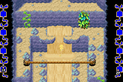 You will be railroaded into running up along a sand river being fed by a sandfall, and the "normal" solution will be self-explanatory by looking at the surroundings as Felix forces his way upward; simply climb the lower-right ivy and walk west along the tightrope, and climb the northwest ivy to the empty chests. Since this sandfall works like the ones in Ankohl Ruins, however, casting Sand allows Felix to climb up the short sandfall itself and rematerialize next to the upper-right bush, which exposes its own ivy ladder and saves fairly good time bypassing the tightrope route.