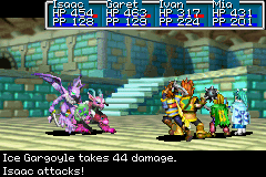 The next room has a series of hoppable platforms that branch down and right. Go right first, for it leads you to a room with a statue; cast Reveal around it to find a treasure chest containing the Asura's Armor, which should likely prove useful for either Isaac or Garet. Return to the hoppable platforms and go down, and exit into the next room.