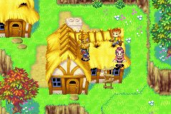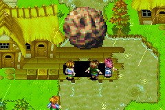 When the game is started, after the cutscene you control a young Isaac. Boulders will slide to block your way when you try to go down the nearby stairs, so first head upwards, pass by young Garet, and he will join you. Go left over the nearby bridge and a small cutscene will occur with a big rolling rock. Head downward, but another small boulder will block your path, so head left into another screen. Pass by a man on the ground who warns you about monsters, and from then on you will engage in random monster encounters with very weak Vermin, Bats, and Wild Mushroom. Head down to the lower right and return to the first area you were in. Head straight downwards to trigger a cutscene involving young Jenna, young Felix, and several parents. Head down and right over the bridge below and enter the lower right area of town. Head downwards to where Jenna is standing and another small cutscene occurs, then retrace your steps back to the last bridge you recently crossed. The next major cutscene that occurs is very important to the overall plot of the game. After it happens and you only control Isaac, run back down and right, and the next cutscene involving Saturos and Menardi will end the prologue sequence.