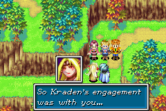 Isaac, Garet, and Jenna, meanwhile, make their normal rounds around village for the day, and if they enter the inn they will encounter the masked Felix. While they don't recognize him, he sure recognizes them and is extremely unnerved by the sight of his former friends and family right there next to him, and he must keep his identity a secret from them, so he must assume a callous disposition and shoo them away. When Isaac and friends head to Kraden's cottage, they encounter Saturos and Menardi (who they had forgotten about from their past encounter three years ago), and after recognizing the intricacies of the current scenario Saturos allows them to go to Kraden. Isaac and friends meet a very troubled Kraden, who tells them what he had learned from the Mars Adepts, and they agree it's possible they could be thieves who came to rob Sol Sanctum. But Kraden, not certain about how accurate Saturos's account of Sol Sanctum was, decides it's better to commence their trip into Sol Sanctum with the added objective of seeing whether the Mars Adepts have actually been to the sanctum, and then notifying the village elders right afterward if so.