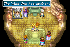 After another lengthy series of cutscenes, you control a more grown-up Isaac, with Garet and Jenna as part of your party. You can explore the town, talk to everyone, and investigate whatever boxes you like, but be sure to travel to the vendors in the shop building at the town's south end and spend your 200 Coins on better defensive equipment for your party members (but focus specifically on Isaac and Garet, as Jenna is a guest character who will leave shortly). Eventually, you should cross the northernmost bridge and head left into the next screen, where a cutscene with Saturos and Menardi ends with you being able to proceed onward to the nearby house, which is Kraden's cottage. Talk to him to trigger another big cutscene, then when he joins you you are ready to enter the Sol Sanctum dungeon. Head back up to the very top of the town, where trying to enter the next screen on top causes a healer to appear and warn you not to go there, and he pushes you back. He will then walk to the right and above; when he enters the shadow of the building in front of you, run to the upper left and enter Sol Sanctum. See Sol Sanctum for full details.