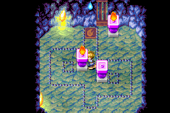 You will end up at a rather complex room with three torch pillars, two of them lit, and a series of water drops constantly dripping from the ceiling; the idea is to move the lit torch pillar onto the floor tile to the left of the closed gate without the dripping water putting the torch out, lest you have to leave the room south and come back in to perform a puzzle reset. First, move the unlit torch pillar two spaces down and one space right, then move the lit torch up one space. Now try to memorize the pattern at which the water drops fall; at each tile water drops onto, there is enough time for the lit pillar to be pushed through the tile with two pushing movements (exactly 3 seconds). Basically, as soon as/right before you hear the drip sound of the water drop to the lower right, push the lit pillar right three spaces. Then push the pillar two spaces up and two spaces left. Then, as soon as/right before you hear the drip of the water drop just to the left of your lit pillar's current position, push it left twice. Now push the pillar down once, left twice, up twice, and right once, and as soon as/right before you hear the drip of the upper left water drop, push it right twice. Now just push it up twice to place the lit pillar onto the floor tile and open the gate, and go up the stairs.