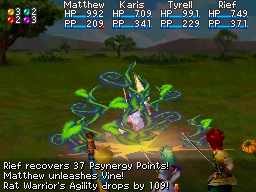 When Vine is unleashed in battle, all enemies' Agility ratings are lowered down to 50% of their normal values, the lowest value the Agility rating can be debuffed down to.