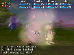 Waft has an okay set damage bonus of 40 and a chance to inflict the powerful Sleep status condition, which renders the enemy unable to do anything for a period of time. It is essentially a "stepping stone" Djinni to tide the player over until later Jupiter Djinn that have both stronger damage bonuses and status conditions that are roughly the same in usefulness.