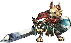 A Wargold (ドッグウォリアー Dog Warrior) is a level 30 variant with black fur, an orange cape, and a blue sword and shield. Wargolds are fought in the west side of Harun Island.